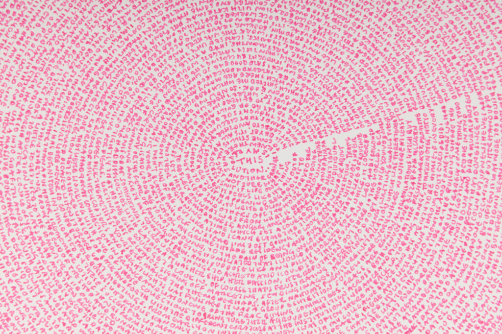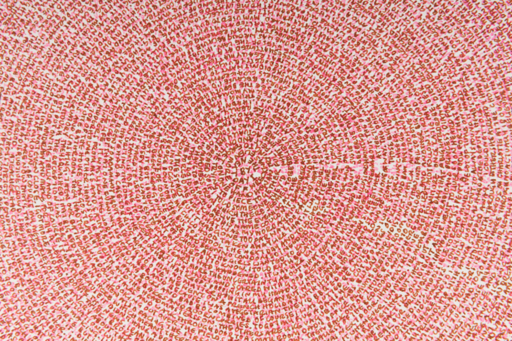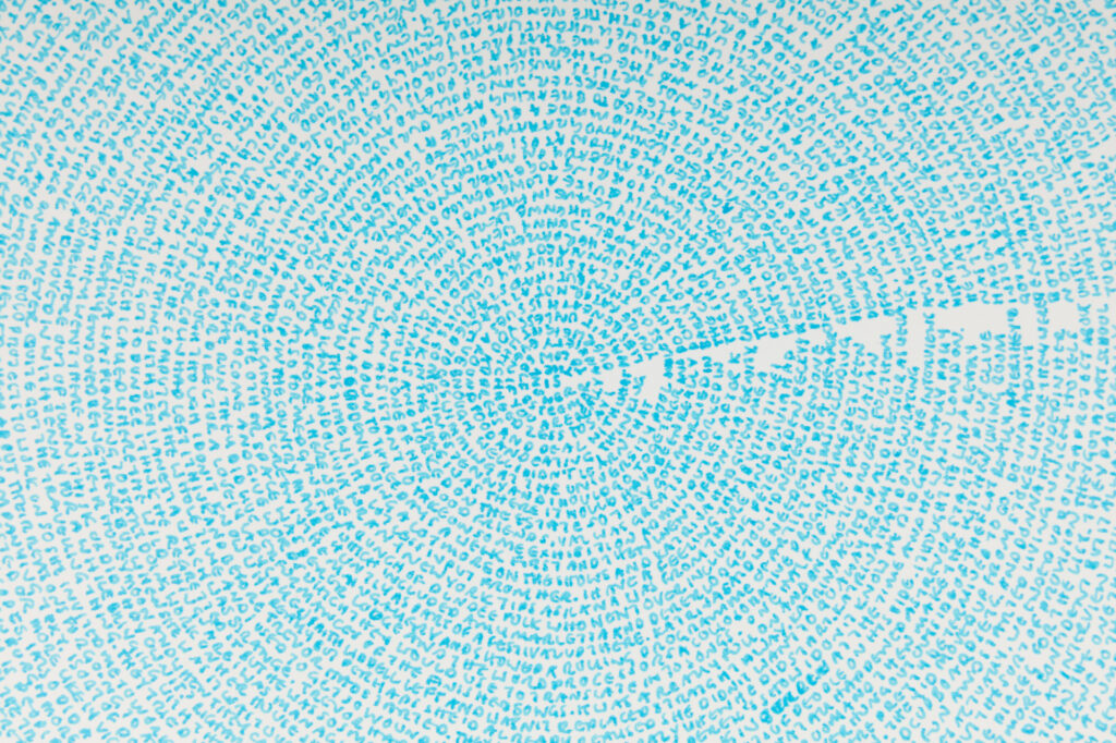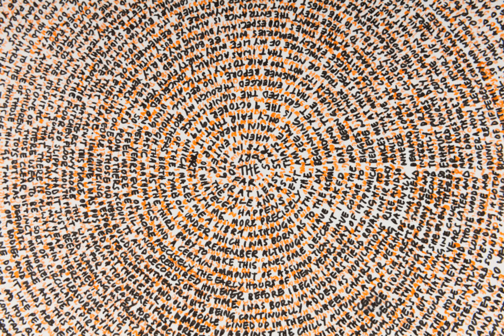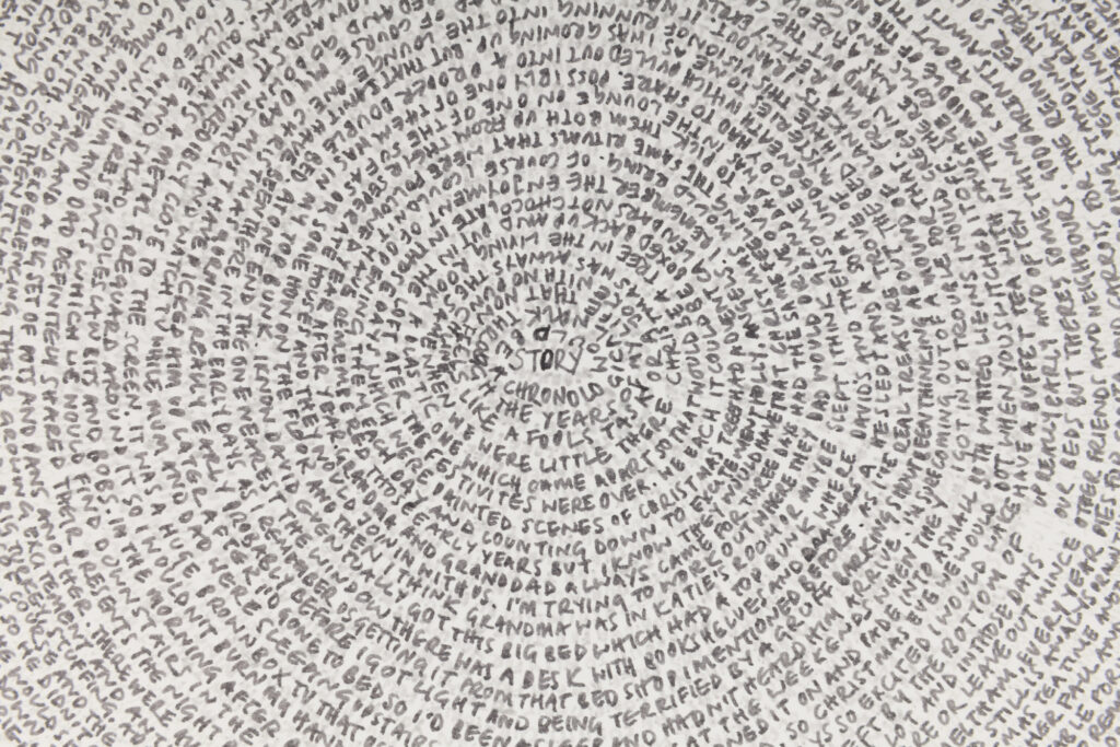 ‘The story so far…’ emerged through my daily ritual, sitting and writing while turning the pages round and round, pouring her memories onto each sheet. Akin to one off daily performances the resulting works contain an imprint of this charged, intimate and repetitive act and are a record of this time as well as the past they contain.
